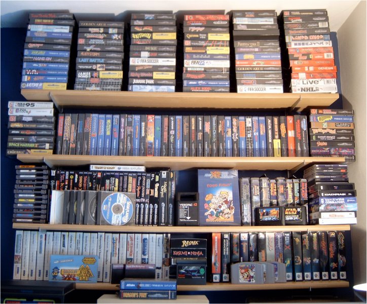 The 2 top shelves contain only megadrive/genesis games. Furthermore you can see games for : Saturn, NES, VideoPac, 32X, 3DO, MasterSystem, Jaguar, XE, N64
